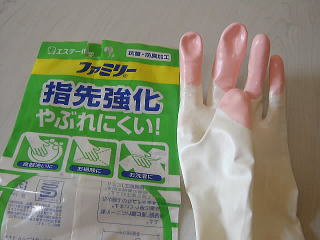 ただ家ではずっとゴム手袋です。手が荒れやすいのです。特にこの最近。ここ2、3年は特にそうです。年をとったからでしょうかあ・・・(汗)。エステー化学のゴム手袋です。